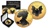 Here is your chance to own the 24KT Gold Clad 2017 American Silver Eagle Dollar U.S. Coin with Black Ruthenium Highlights. To highlight the original coin design, the Merrick Mint has clad the coin entirely in 24KT Gold with Walking Liberty on the coin obverse and Eagle on the coin reverse clad in Black Ruthenium. The American Silver Eagle Dollar coin is genuine legal tender struck by the U.S. Mint. It is minted in one full ounce of .999 PURE SILVER and measures a massive 40.6mm in diameter. Each coin comes in an acrylic coin holder and includes a Full Color 2-sided Certificate of Authenticity.