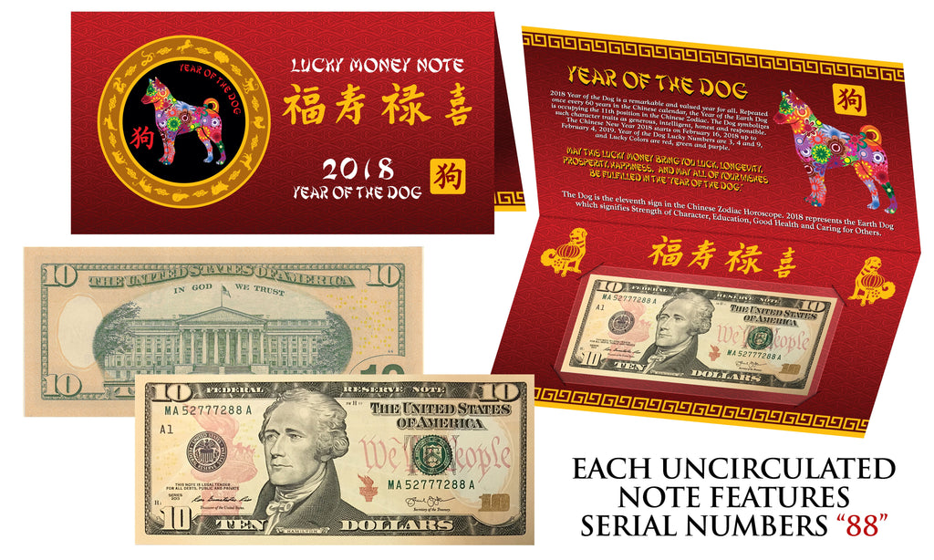 In celebration of the 2018 Year of the Dog Chinese Lunar New Year, we have announced the newest addition to its Lucky Money Collection…2018 Year of the Dog Lucky 8’s Serial Number Banknotes. The Year of the Dog 2018 product is designed with Decorative Chinese Symbolism and packaged in a Symbolic Red Folder adorned in Full-Color. Each folder contains an uncirculated Genuine Legal Tender United States Banknote.