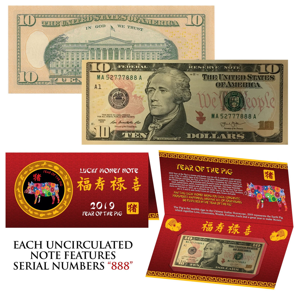 In celebration of the 2019 Year of the Pig Chinese Lunar New Year, we have announced the newest addition to its Lucky Money Collection…2019 Year of the Pig Lucky 8’s Serial Number Banknotes. The Year of the Pig 2019 product is designed with Decorative Chinese Symbolism and packaged in a Symbolic Red Folder adorned in Full-Color. Each folder contains an uncirculated Genuine Legal Tender United States Banknote.