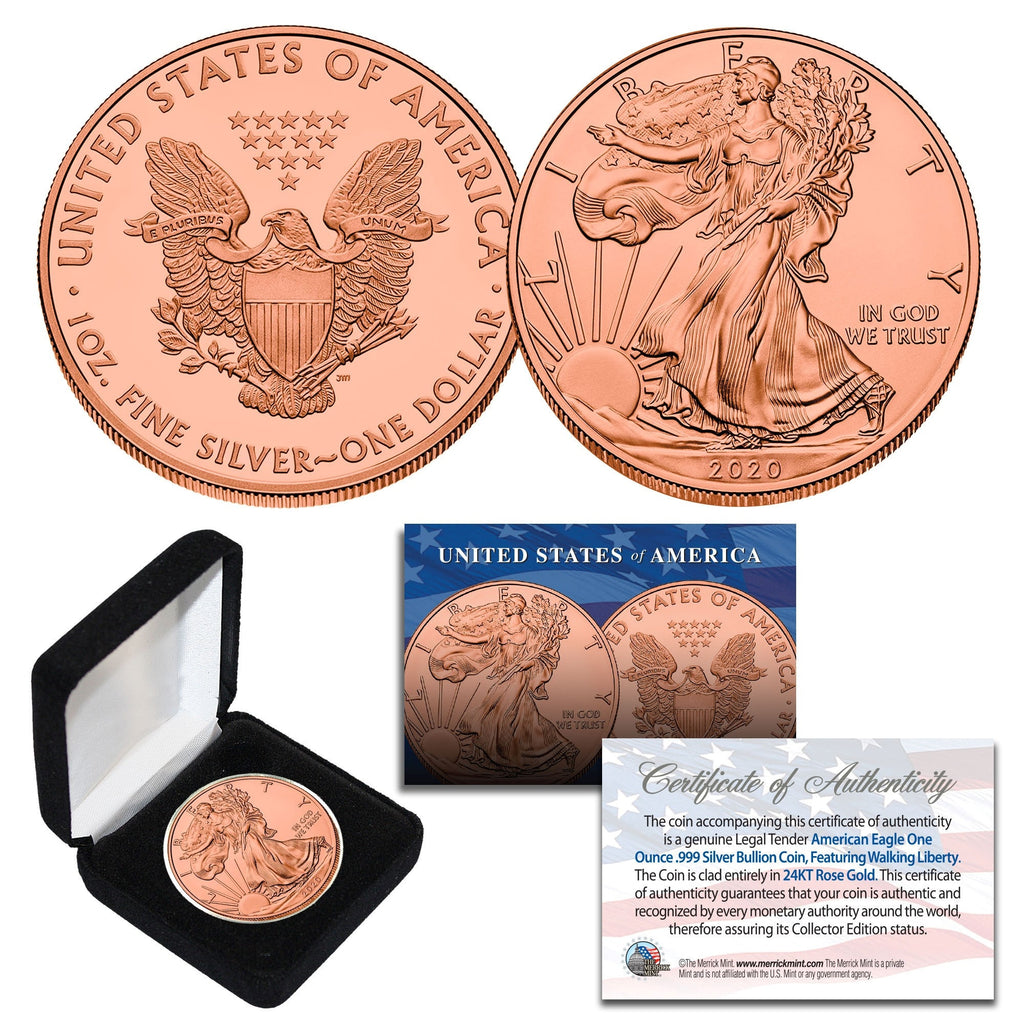 Here is your chance to own a genuine 24 Karat ROSE Gold Plated 2020 American .999 Fine Silver Eagle Dollar U.S. Coin. The American Silver Eagle Dollar coin is genuine legal tender struck by the U.S. Mint. It is minted in one full ounce of .999 PURE SILVER and measures a massive 40.6mm in diameter. Each coin comes in an acrylic coin holder and includes a Full Color 2-sided Certificate of Authenticity.