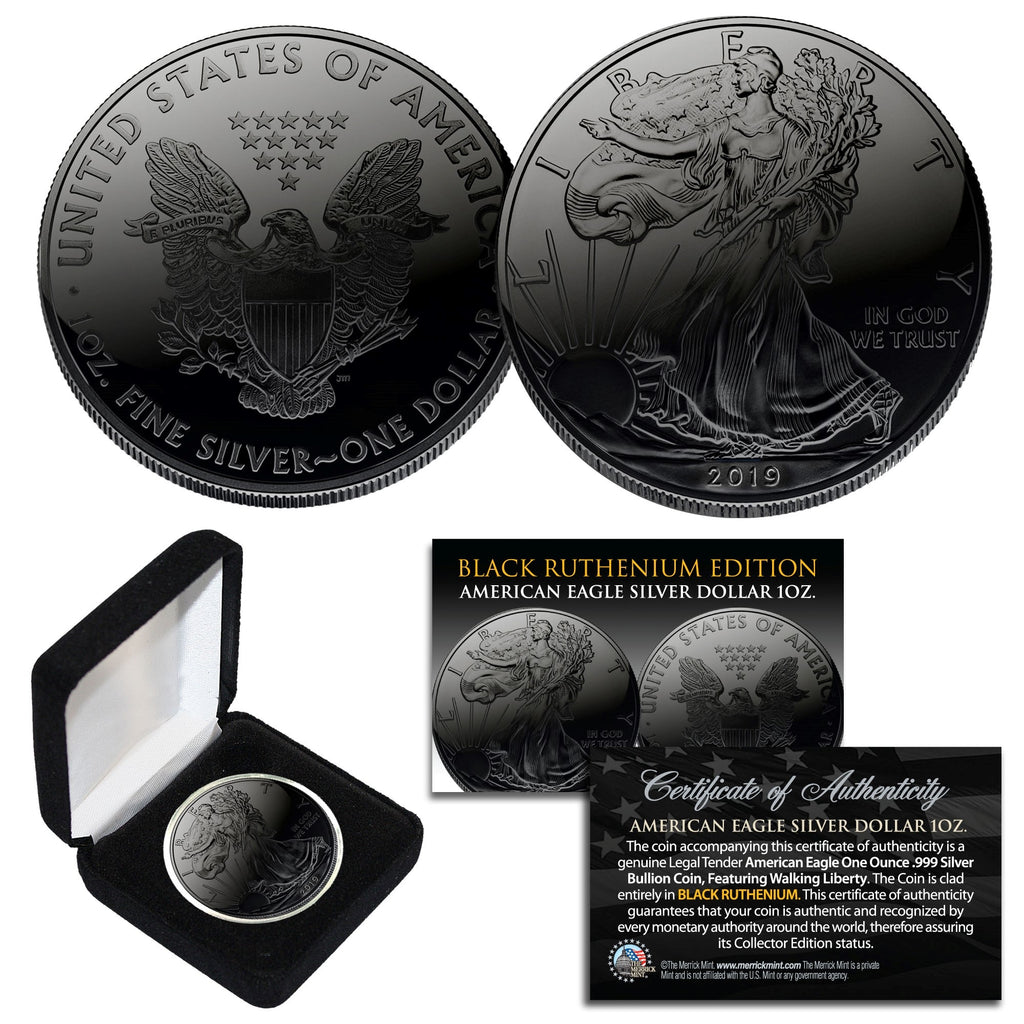 Here is your chance to own the first ever complete BLACK RUTHENIUM EDITION 2019 American Silver Eagle Dollar U.S. Coin. The American Silver Eagle Dollar coin is genuine legal tender struck by the U.S. Mint. It is minted in one full ounce of .999 PURE SILVER and measures a massive 40.6mm in diameter. To highlight the original coin design, the Merrick Mint has clad the coin entirely in Black Ruthenium. Black Ruthenium is a type of platinum metal that looks like a dark platinum, but is 100 times Rarer. Ruthenium is a chemical element with the symbol RU & Atomic # 44. It is a rare transition metal belonging to the platinum group of the periodic table. Each coin comes in a premium coin capsule with a Certificate of Authenticity to guarantee that your coin is authentic and recognized by every monetary authority around the world, assuring its Collector Edition status.