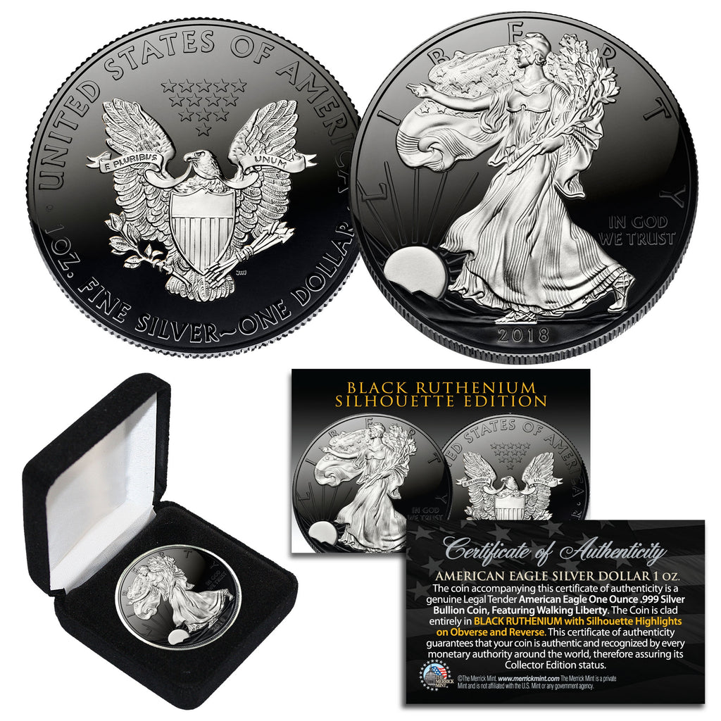 Here is your chance to own the BLACK RUTHENUM SILHOUETTE EDITION 2018 American Silver Eagle Dollar U.S. Coin. To highlight the original coin design, the Merrick Mint has clad the coin entirely in Black Ruthenium with the Walking Liberty Silhouette on the coin obverse and the Eagle Silhouette on the coin reverse. This reverse knockout Silhouette edition is beautifully done by leaving the original coin engraving of the Lady Liberty and Eagle untouched and Black Ruthenium all around it. The American Silver Eagle Dollar coin is genuine legal tender struck by the U.S. Mint. It is minted in one full ounce of .999 PURE SILVER and measures a massive 40.6mm in diameter. Each coin comes in an acrylic coin holder and includes a Full Color 2-sided Certificate of Authenticity.
