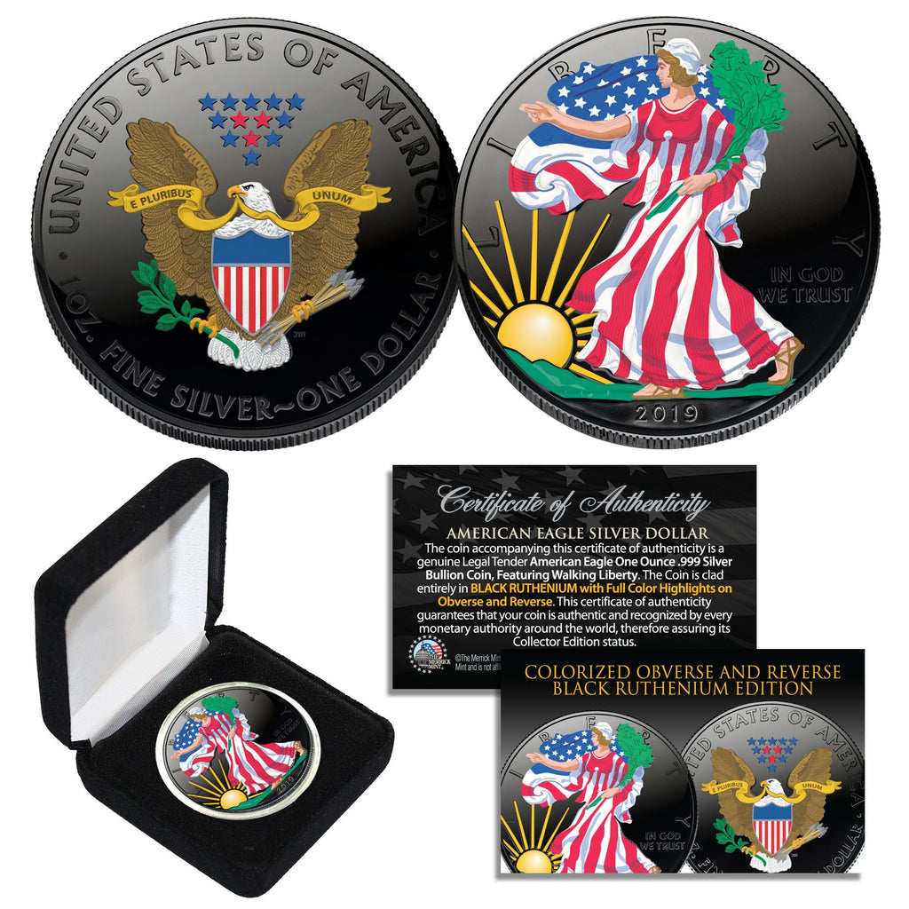 2019 Silver Eagles Clad in Black Ruthenium and Color! You’ve heard of black ruthenium coins, now we bring to you for the first time ever, the Silver Eagle completely gilded in black and color. Some consider this the most beautiful coin ever! This incredible addition to your Silver Eagle collection has been lavished in the relatively rare metal Black Ruthenium. Discovered in 1844, Ruthenium belongs to the Platinum group on the periodic table, and sits just a few spots lower on the list of rare Earth elements. Plus, parts of the designs on both the obverse and reverse have been beautifully colorized, making them stand out in decadent fashion from the darkened fields! Each comes in Brilliant Uncirculated (BU) condition, housed in a black felt box. Collectors will be scrambling to add them to their collections, so secure yours now!