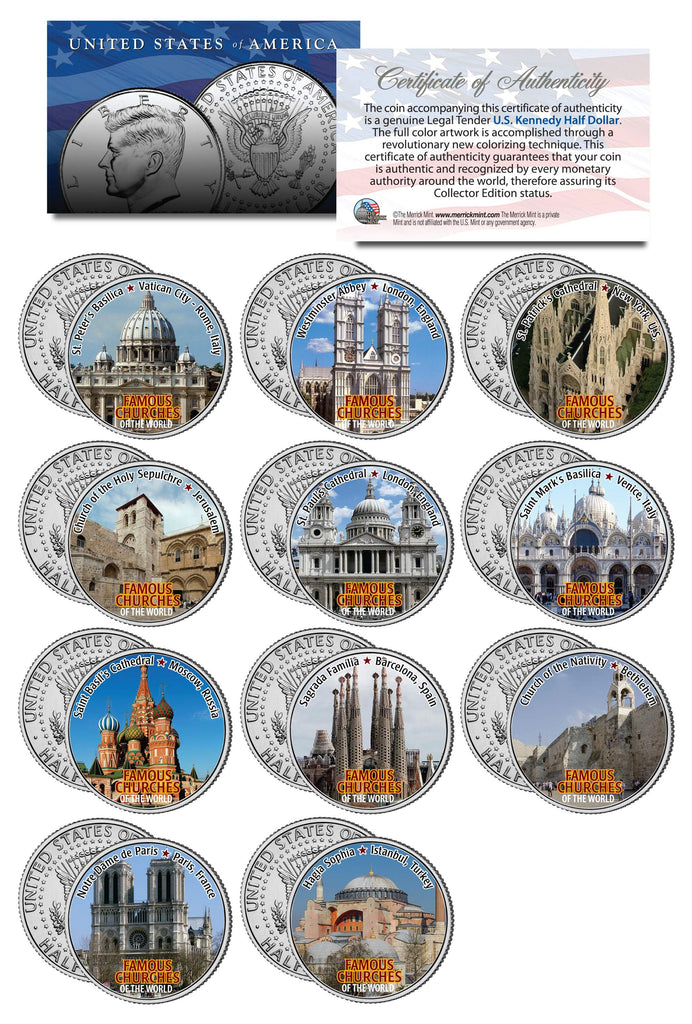 Here is your chance to own a complete set of eleven (11) colorized JFK Kennedy Half Dollar U.S. Coins of FAMOUS CHURCHES OF THE WORLD. These high-quality, genuine Legal Tender United States coins have been colorized using a unique painstaking multicolor authentic process by the Merrick Mint. Colorizing coins involves the unique application of special inks directly to the surface of a coin that achieves a level of detail, color saturation, and durability that is #1 in the coin industry. The result is an everlasting colorized coin collectible of ultra-high quality. Each coin comes in a premium coin capsule. The 11-coin set comes with a Certificate of Authenticity to guarantee that your coins are authentic and recognized by every monetary authority around the world, assuring its Collector Edition status. The Kennedy half dollar is a U.S. fifty cent coin with coin year and mint marks chosen at random.