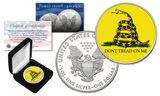 Here is your opportunity to own a GADSDEN FLAG "Don't Tread On Me" colorized American Silver Eagle Dollar U.S. coin, which has been beautifully colorized by The Merrick Mint. One of America’s most iconic images, the Gadsden Flag is a historical American flag with a yellow field depicting a rattlesnake coiled and ready to strike. Positioned below the rattlesnake are the words "DON'T TREAD ON ME". The flag is named after American general and statesman Christopher Gadsden, who designed it in 1775 during the American Revolution. Leading up to the Revolution, it was a symbol of America’s independence movement. The American Silver Eagle Dollar coin is genuine legal tender struck by the U.S. Mint. It is minted in one full ounce of .999 PURE SILVER and measures a massive 40.6mm in diameter. To keep your coin safe and in peak condition, each coin is showcased in a deluxe black felt coin display gift box, as shown. This Legal Tender United States coin has been colorized with an application of special inks directly to the surface of the coin, using a unique and painstakingly multi-color coin process, which achieves a level of detail, color saturation and durability that is #1 in the coin industry. The result is an everlasting colorized coin collectible of ultra-high quality.