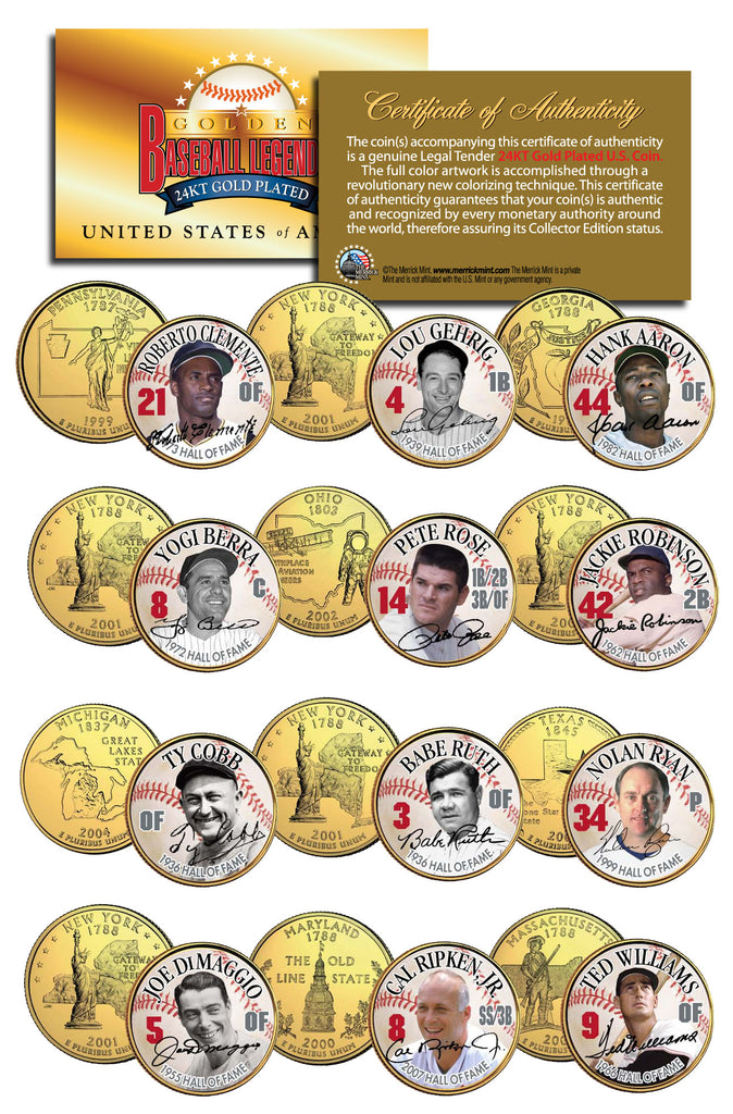 Here is your chance to own a complete set of twelve (12) 24KT Gold Plated and colorized Statehood Quarters U.S. Coins featuring HALL OF FAMERS, in this Limited Edition GOLDEN BASEBALL LEGENDS Coin Series. This 12-coin set features a rare baseball background design with each player’s statehood quarter matched to the state of his team. These high-quality, genuine Legal Tender United States coins have been layered in Genuine 24 Karat Gold, and then colorized using a unique painstaking multicolor authentic process by the Merrick Mint. Colorizing coins involves the unique application of special inks directly to the surface of a coin that achieves a level of detail, color saturation, and durability that is #1 in the coin industry. The result is an everlasting colorized coin collectible of ultra-high quality. Each 24KT Gold Plated coin features an emblematic design of the state on the reverse and colorized images of GOLDEN BASEBALL LEGENDS on the obverse (portrait of George Washington design). Each coin comes in a premium coin capsule. The 12-coin set comes with a Certificate of Authenticity to guaranty that your coins are authentic and recognized by every monetary authority around the world, assuring its Collector Edition status.