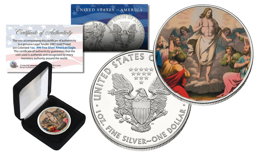 Here is your opportunity to own a JESUS CHRIST - RESURRECTION colorized American Silver Eagle Dollar U.S. coin, which has been beautifully colorized by The Merrick Mint. The American Silver Eagle Dollar coin is genuine legal tender struck by the U.S. Mint. It is minted in one full ounce of .999 PURE SILVER and measures a massive 40.6mm in diameter. To keep your coin safe and in peak condition, each coin is showcased in a deluxe black felt coin display gift box, as shown. This Legal Tender United States coin has been colorized with an application of special inks directly to the surface of the coin, using a unique and painstakingly multi-color coin process, which achieves a level of detail, color saturation and durability that is #1 in the coin industry. The result is an everlasting colorized coin collectible of ultra-high quality.