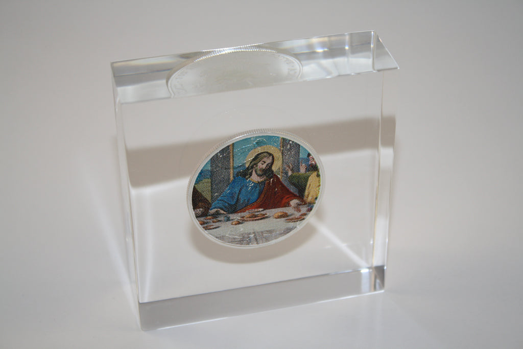 • JESUS LAST SUPPER American Silver Eagle Colorized Coin Lucite Paperweight Square