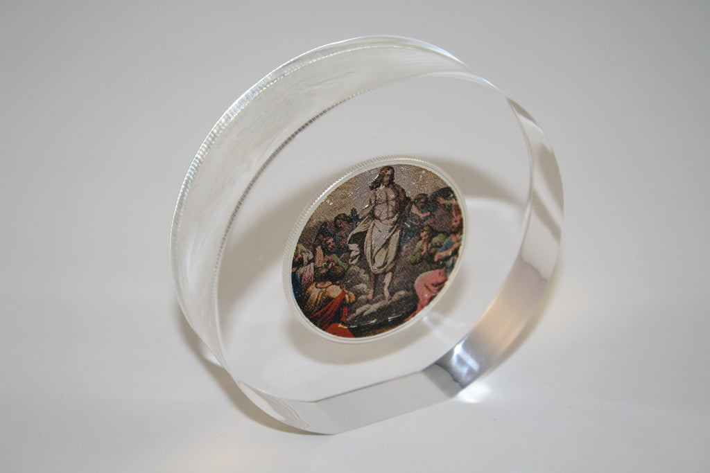 The beautiful Jesus Christ colorized 2001 American Silver Eagle coin is permanently set in an acrylic Lucite paperweight, making it a magnificent religious display piece for your home or office. The Jesus Christ colorized 2001 U.S. Silver Eagle Dollar is genuine legal tender struck by the U.S. Mint. It is minted in one full ounce of .999 PURE SILVER and measures 40.6mm in diameter. This brilliant uncirculated silver dollar has been enhanced by a unique colorization process. Coin inside this clear acrylic Lucite block gives it a 3D look, this is truly a piece you will cherish and share with all. The paperweight is 2-7/8” in height.