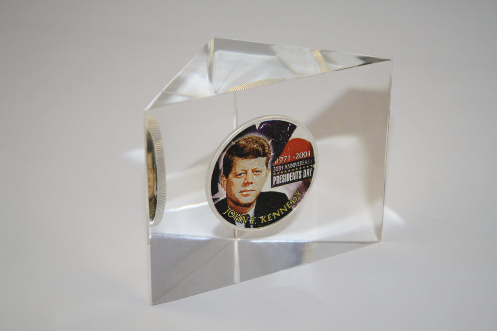• JOHN KENNEDY American Silver Eagle Colorized Coin Lucite Paperweight Triangular