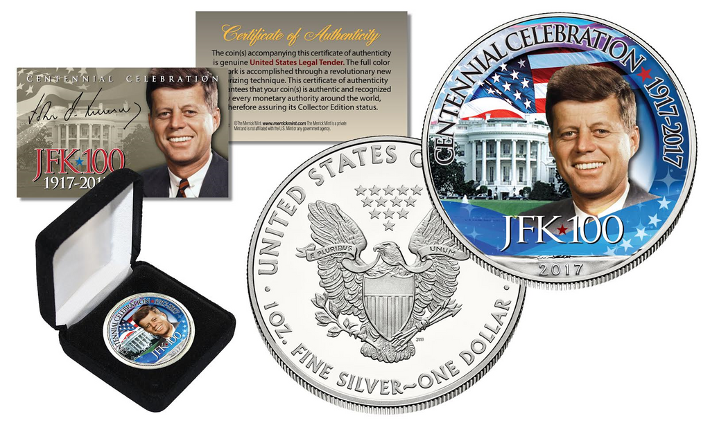 Here is your opportunity to own a PRESIDENT JOHN F. KENNEDY JFK100 Centennial Celebration American Silver Eagle Dollar U.S. coin, which has been beautifully colorized by The Merrick Mint. The presidency of John Fitzgerald Kennedy began with a towering challenge: “Ask not what your country can do for you, ask what you can do for your country.” All too soon, it ended, with his tragic assassination. Yet, President Kennedy’s shining visions of freedom and a boundless future of “new frontiers” still inspire Americans – and the whole world. Now, in honor of the 100th Anniversary of this revered President’s birth, the Merrick Mint presents a magnificent new coin collection. Limited-edition coins connected to once-in-a-lifetime events like this 100th Anniversary of the birth of 35th U.S. President John Fitzgerald Kennedy always generate heavy demand. Don’t miss out on this once-in-a-lifetime opportunity to acquire this limited edition collectible. The American Silver Eagle Dollar coin is genuine legal tender struck by the U.S. Mint. It is minted in one full ounce of .999 PURE SILVER and measures a massive 40.6mm in diameter. This Legal Tender United States coin has been colorized with an application of special inks directly to the surface of the coin, using a unique and painstakingly multi-color coin process, which achieves a level of detail, color saturation and durability that is #1 in the coin industry. The result is an everlasting colorized coin collectible of ultra-high quality.