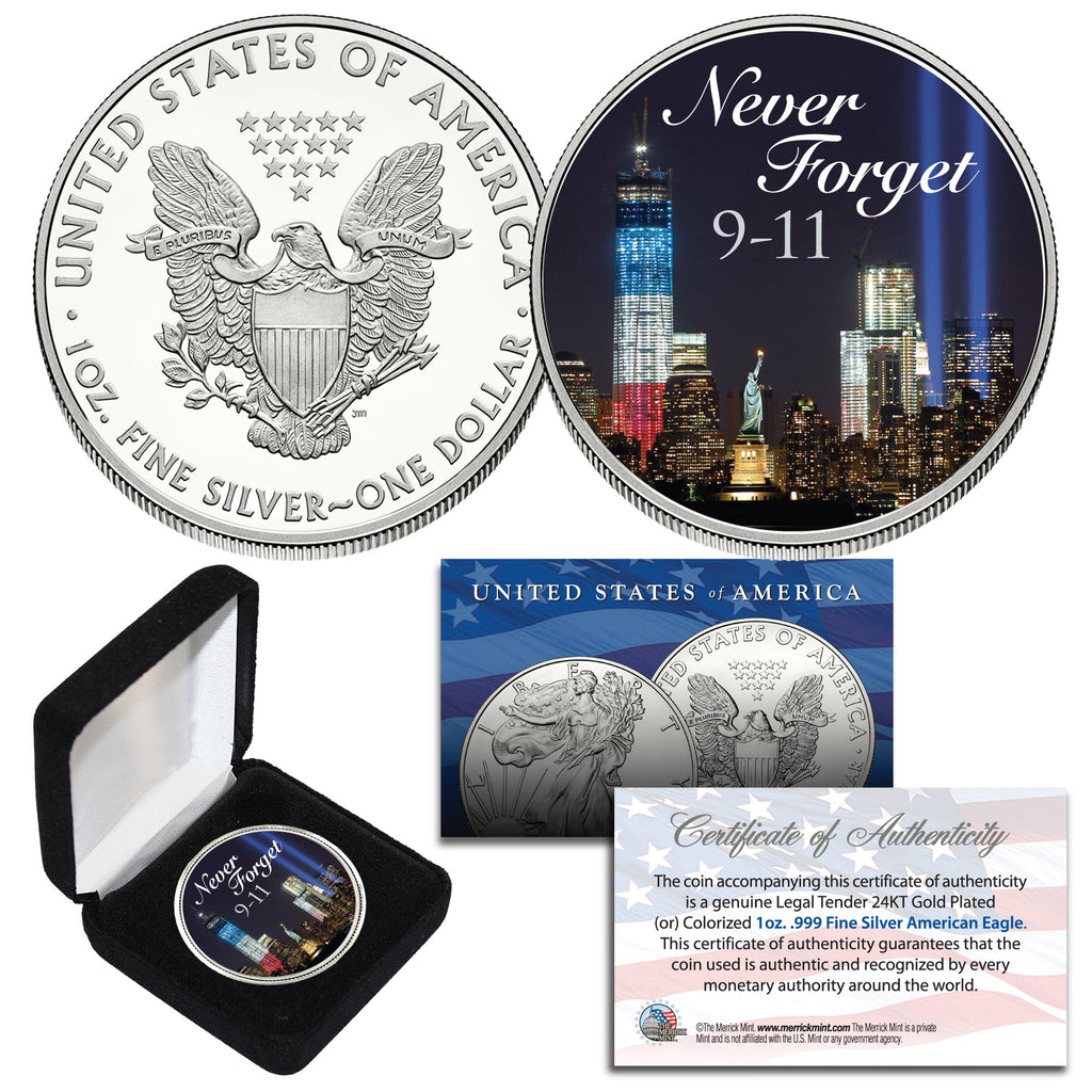 The "NEVER FORGET 9-11" colorized 2018 U.S. Silver Eagle Dollar coin is genuine legal tender struck by the U.S. Mint. It is minted in one full ounce of .999 PURE SILVER and measures a massive 40.6mm in diameter. This brilliant uncirculated silver dollar has been enhanced by a unique colorization process. Each coin comes in a premium coin capsule with a Certificate of Authenticity.