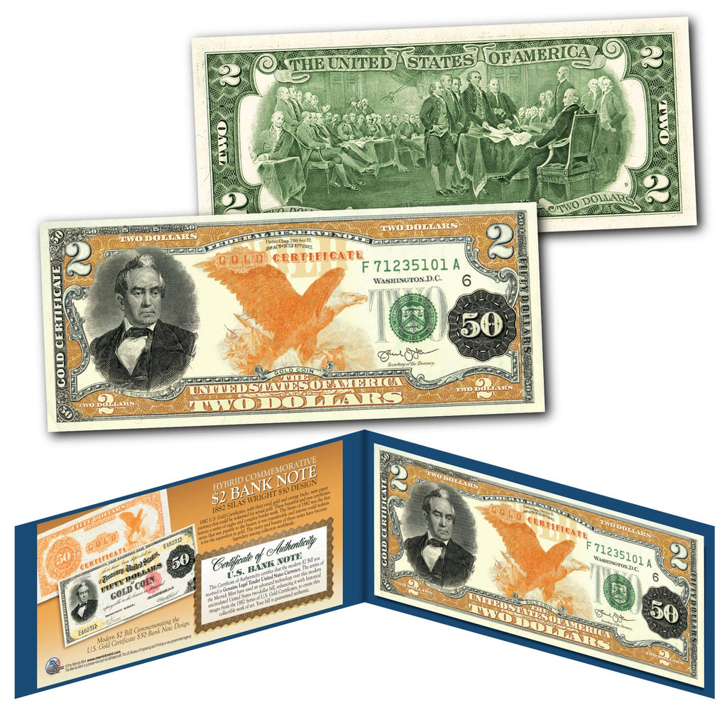 • 1882 Series Silas Wright $50 Gold Certificate designed on a New Modern Genuine U.S. $2 Bill