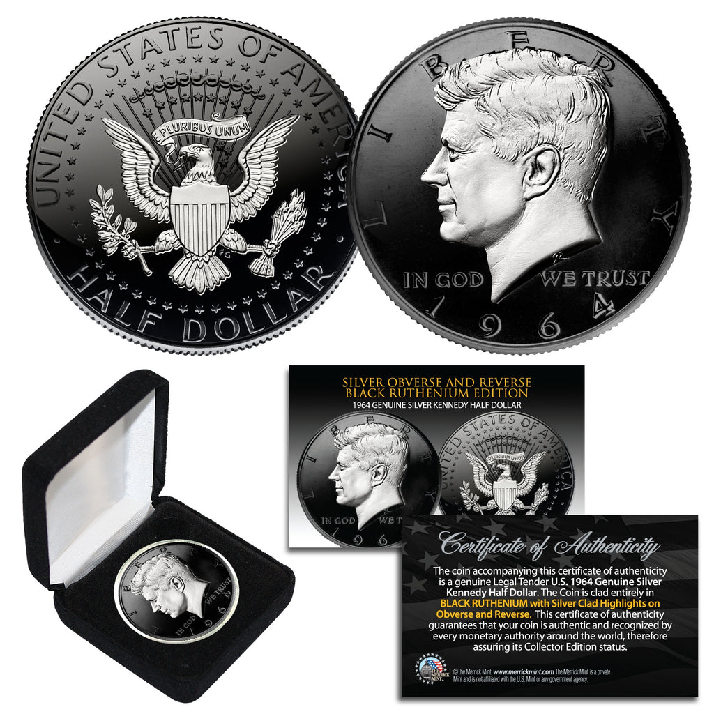 Here is your chance to own a genuine legal tender BLACK RUTHENIUM EDITION 1964 Brilliant Uncirculated Silver Kennedy Half Dollar with Genuine Silver Highlights on the Obverse & Reverse. The coin is coated with Black Ruthenium, which is a type of platinum metal that looks like a dark platinum, but is 100 times Rarer. Ruthenium is a chemical element with the symbol RU & Atomic # 44. It is a rare transition metal belonging to the platinum group of the periodic table.