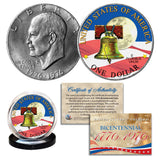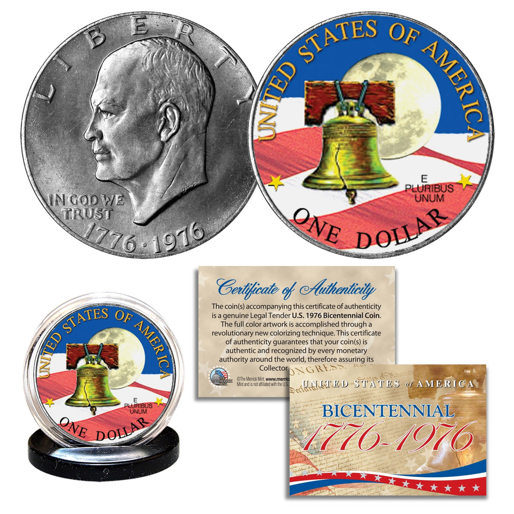 Here is your chance to own a beautifully colorized Bicentennial 1976 Eisenhower IKE Dollar U.S. Coin. This high-quality genuine Legal Tender U.S. coin has been beautifully colorized using a unique painstaking multicolor authentic process by the Merrick Mint. Colorizing coins involves the unique application of special inks directly to the surface of a coin that achieves a level of detail, color saturation, and durability that is #1 in the coin industry. The result is an everlasting colorized coin collectible of ultra-high quality. Each coin comes in a premium coin capsule with a Certificate of Authenticity to guaranty that your coin is authentic and recognized by every monetary authority around the world, assuring its Collector Edition status. The Eisenhower dollar is a U.S. one-dollar large coin with coin mint mark chosen at random.