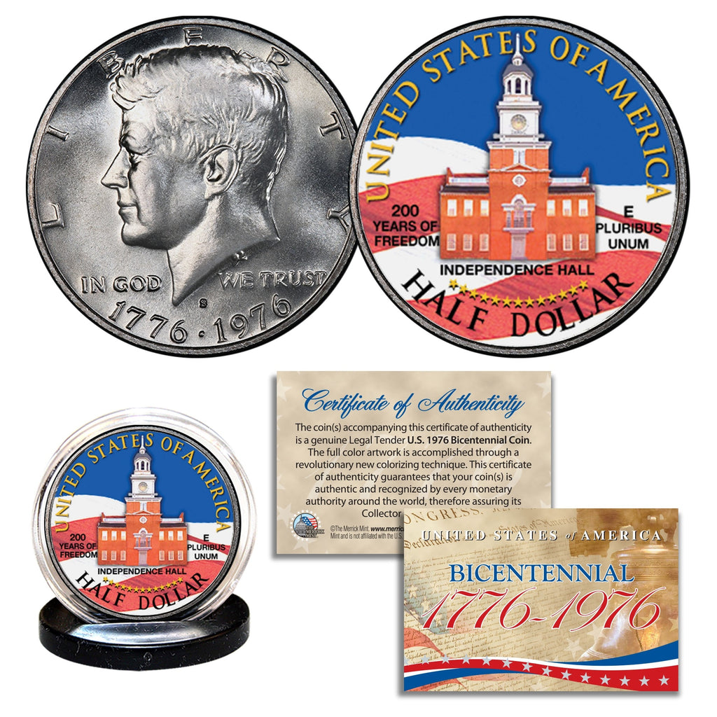 Here is your chance to own a beautifully colorized Bicentennial 1976 JFK Kennedy Half Dollar U.S. Coin. This high-quality genuine Legal Tender U.S. coin has been beautifully colorized using a unique painstaking multicolor authentic process by the Merrick Mint. Colorizing coins involves the unique application of special inks directly to the surface of a coin that achieves a level of detail, color saturation, and durability that is #1 in the coin industry. The result is an everlasting colorized coin collectible of ultra-high quality. Each coin comes in a premium coin capsule with a Certificate of Authenticity to guaranty that your coin is authentic and recognized by every monetary authority around the world, assuring its Collector Edition status. The Bicentennial 1976 Kennedy half dollar is a U.S. fifty cent coin with mint marks chosen at random.