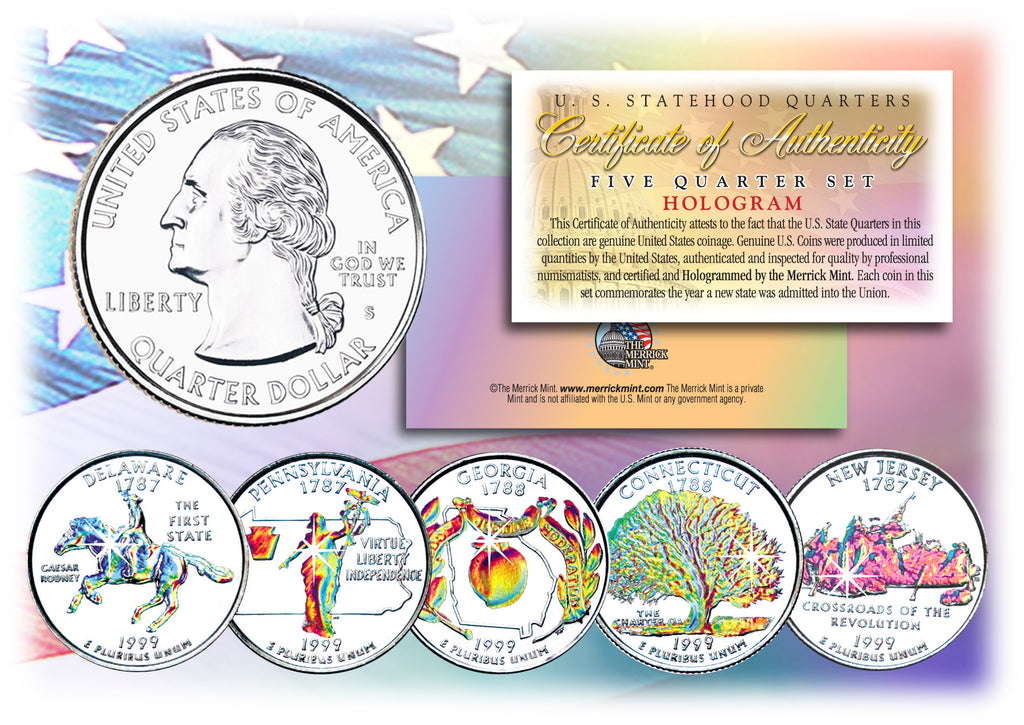 Here is your chance to own a complete set of five (5) hologram enhanced 1999 Statehood Quarters U.S. Coins featuring five states: DE, PA, NJ, GA, CT. Each coin is beautifully enhanced on the reverse with a permanent hologram by the Merrick Mint to highlight the original design using a unique authentic process. The result is an everlasting hologram coin collectible of ultra-high quality that is #1 in the industry. Each coin features a unique state design on the reverse and a common obverse with portrait of George Washington. Each coin is genuine legal tender of the United States and comes in an acrylic coin holder and includes a Full Color 2-sided Certificate of Authenticity. The State Quarters Program was the most popular commemorative coin program in United States history.