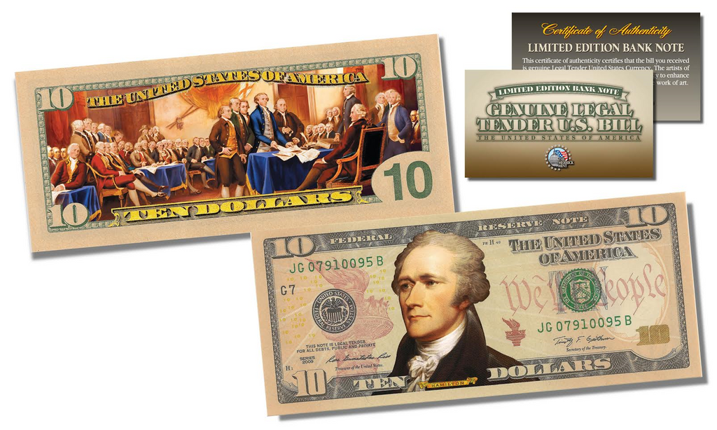 This uncirculated $10 Bill is Genuine Authentic Legal Tender of the United States, which has been enhanced with beautiful colorized images. The full colorized image is accomplished through a revolutionary new authentic & genuine colorization process. Included is a Certificate of Authenticity to guaranty that your bills are authentic and recognized by every monetary authority around the world, and assuring it's Collector Edition status.