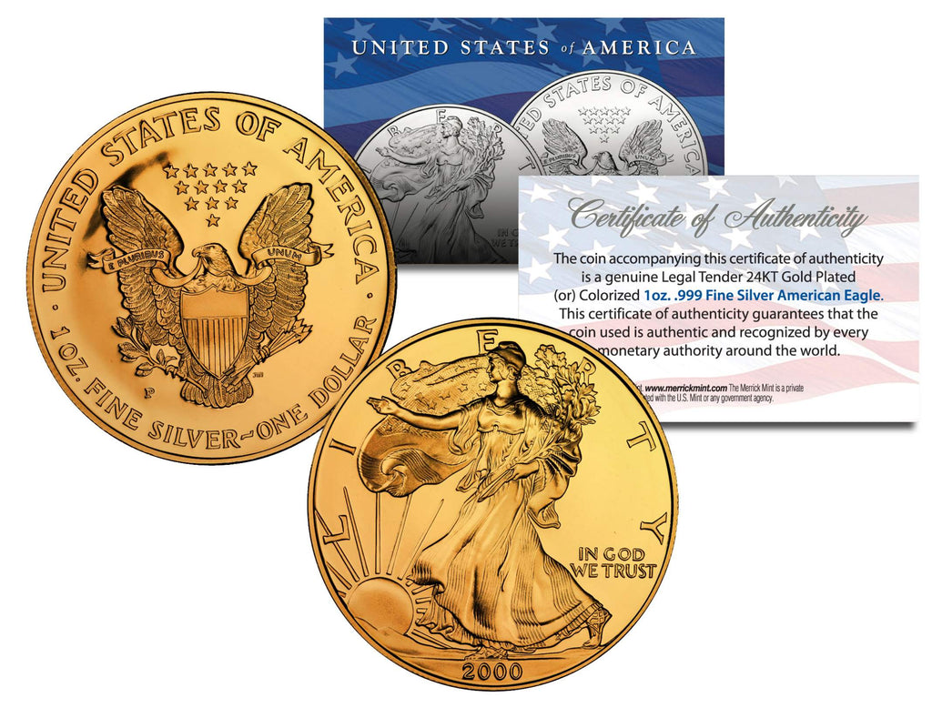 Some coins have gold frosting from silver tarnishing, but overall appearance is very nice. Here is your chance to own a 24KT Gold Plated 2000 American Silver Eagle Dollar U.S. coin. Coin is minted in one full ounce of .999 PURE SILVER and measures a massive 40.6mm in diameter. Each genuine legal tender U.S. coin is 24KT Gold Plated by the Merrick Mint to highlight the original design using a unique authentic process. The result is an everlasting 24KT Gold Plated coin collectible of ultra-high quality. Each coin comes in a premium coin capsule with a Certificate of Authenticity to guarantee that your coin is authentic and recognized by every monetary authority around the world, assuring its Collector Edition status. Walking Liberty design on the obverse and heraldic eagle design on the reverse.