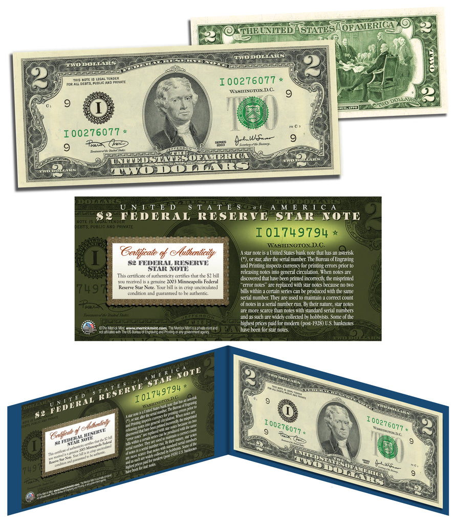 Here is your opportunity to own a $2 STAR NOTE bill from the Federal Reserve Bank of Minneapolis. Each $2 Bill is in FRESH, CRISP, UNCIRCULATED condition, and was directly removed from untouched wrapped Federal Reserve BEP sealed packs. Each bill comes in a blue display portfolio with a Certificate of Authenticity to guaranty that your bill is an authentic $2 Federal Reserve Star Note. A star note is a bank note that has an asterisk (*), or star, after the serial number. In the US, the Bureau of Engraving and Printing inspects currency for printing errors prior to releasing notes into general circulation. When notes are discovered that have been printed incorrectly (such as having the serial numbers upside down, etc.) the misprinted "error notes" are replaced with star notes because no two bills within a certain series can be produced with the same serial number. They are used to maintain a correct count of notes in a serial number run. By their nature, star notes are extremely scarcer than notes with standard serial numbers and as such are widely collected by numismatists. Some of the highest prices paid for modern U.S. banknotes have been for star notes. Former U.S. President Thomas Jefferson is featured on the obverse of the note. The Signing of the Declaration of Independence by John Trumbull is featured on the reverse. It is the only U.S. Currency note that features two Presidents, John Adams and Thomas Jefferson, and it is one of the most rarely seen BILLS in circulation and actual use.