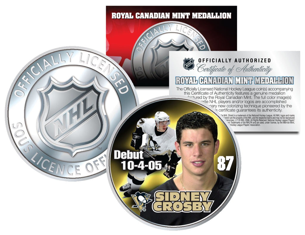 Here is your chance to own the 2005-06 SIDNEY CROSBY DEBUT NHL Medallion. This officially licensed Royal Canadian Mint NHL Medallion is beautifully colorized with images of SIDNEY CROSBY. Each medallion is officially licensed and approved by the National Hockey League (NHL). This officially licensed medallion has been colorized using a unique multicolor authentic process by the Merrick Mint. Colorizing medallions involves the unique application of special inks directly to the surface using a unique and painstakingly multi-color process, that achieves a level of detail, color saturation, and durability that is #1 in the industry. Each medallion comes in a coin capsule with a NHL Certificate of Authenticity. Each medallion is about the same size as a U.S. Half Dollar coin and features a NHL logo with English and French wording design on the reverse and colorized SIDNEY CROSBY images on the obverse.