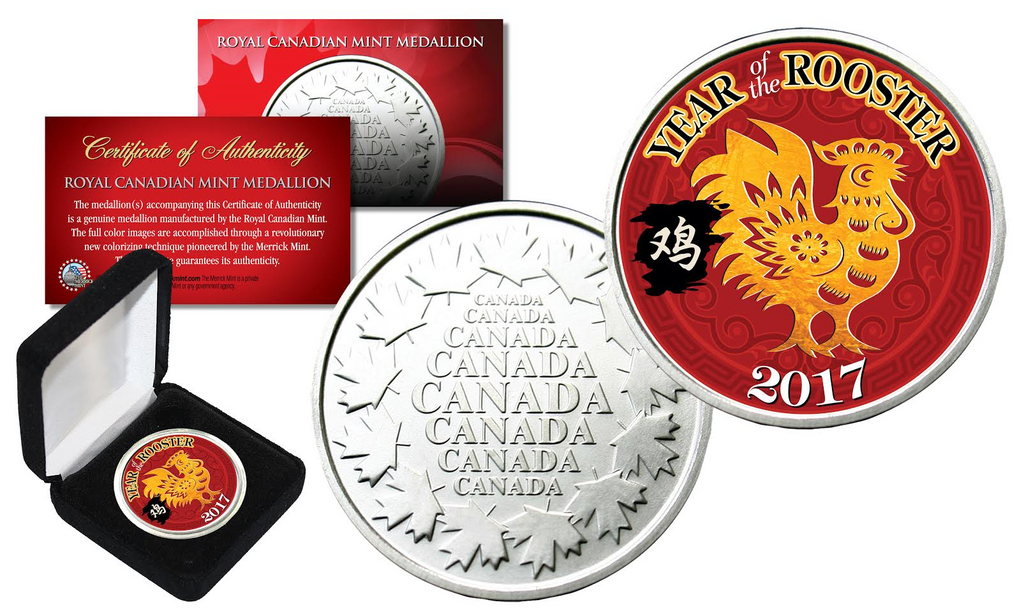 This CHINESE NEW YEAR 2017 – YEAR OF THE ROOSTER COIN is lucky money and a treasured collectible. Here is your chance to own or gift a beautifully colorized famous YEAR OF THE ROOSTER Royal Canadian Mint Medallion Coin. This medallion has been colorized with an application of special inks directly to the surface, using a unique painstaking multicolor authentic process. Colorizing coins involves the unique application of special inks directly to the surface of a coin that achieves a level of detail, color saturation, and durability that is #1 in the coin industry. The result is an everlasting colorized coin collectible of ultra-high quality. Each coin comes in a premium coin capsule with a Certificate of Authenticity..