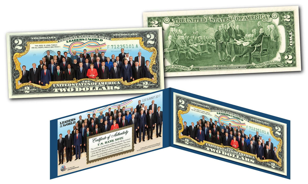 This 2017 World Leaders uncirculated $2 Bill is Genuine Authentic Legal Tender of the United States, which has been enhanced with beautiful colorized images. The G20 Summit Meeting is the annual meeting of the the leaders of the world’s 19 wealthiest nations plus the European Union. The 2017 Summit Meeting took place in Hamburg, Germany. The full colorized images are accomplished through a revolutionary new authentic & genuine colorization process pioneered by The Merrick Mint. Included is a Certificate of Authenticity to guarantee that your bills are authentic and recognized by every monetary authority around the world, and assuring its Collector Edition status. Only genuine Legal Tender $2 United States Bills are used for this unique colorization process. Each $2 Bill is in FRESH, CRISP, UNCIRCULATED condition, and was directly removed from untouched wrapped Federal Reserve sealed packs. Former U.S. President Thomas Jefferson is featured on the obverse of the note, along with the special colorization overlay. The Signing of the Declaration of Independence by John Trumbull is featured on the reverse. It is the only U.S. Currency note that features two Presidents, John Adams and Thomas Jefferson, and it is one of the most rarely seen BILLS in circulation and actual use.