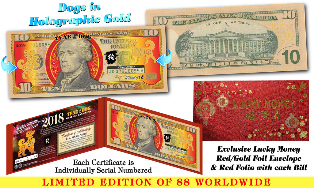 2018 Chinese New Year - YEAR OF THE DOG - Gold Hologram Legal Tender U.S. $10 BILL - LIMITED & NUMBERED of 88