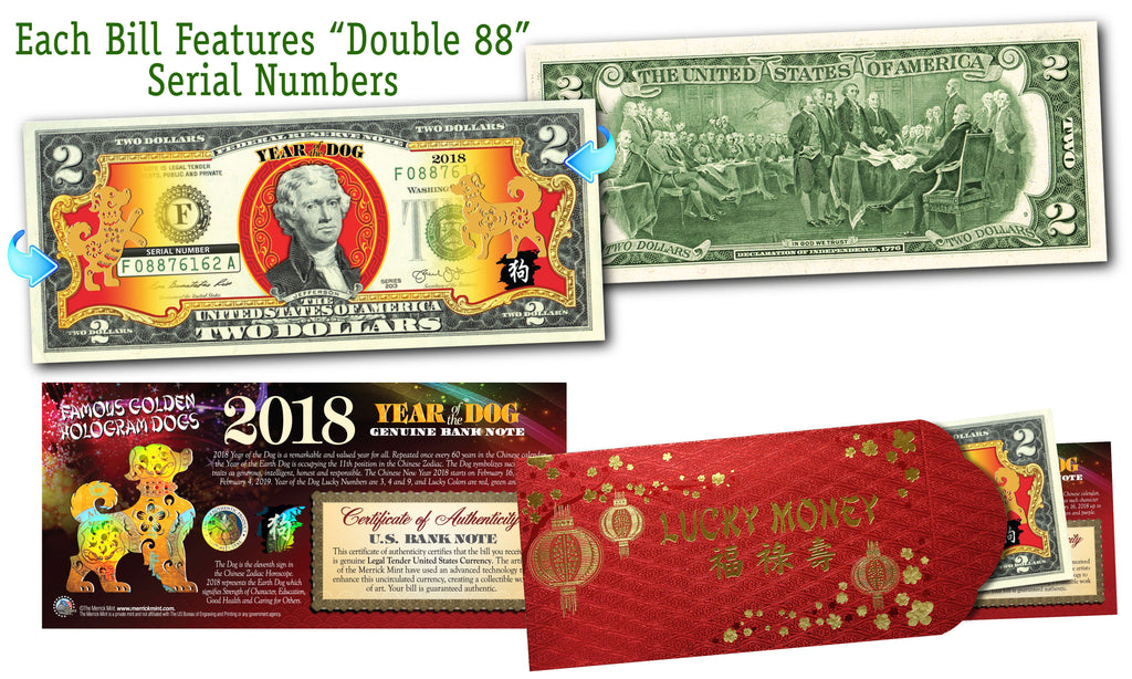 This is the original 2018 Chinese New Year $2 Bill. This special lucky year of 2018 has been updated with a premium Red Envelope that is hand made with a special Lunar Red and Gold Leaf. The deluxe envelope is a premium edition made with ultra-high quality materials. This is an opportunity to acquire a true Collector’s Item, a GENUINE LEGAL TENDER U.S. $2 Bill that is enhanced with a special Colorization process by The Merrick Mint. This bill is enhanced with Holographic Gold images of DOG's to represent the 2018 Chinese Year of the Dog. Never before has a $2 bill been enhanced with colorization, making it the most ornate and historically attractive piece of U.S. currency. Each $2 Bill is in FRESH, CRISP, UNCIRCULATED condition, and was directly removed from untouched wrapped Federal Reserve sealed packs. Former U.S. President Thomas Jefferson is featured on the obverse of the note, along with the special colorization overlay. The Signing of the Declaration of Independence by John Trumbull is featured on the reverse. It is the only U.S. Currency note that features two Presidents, John Adams and Thomas Jefferson, and it is one of the most rarely seen bills in circulation and actual use. This New Year, give a gift of good fortune to family and friends with the famous Golden Hologram 2018 Chinese New Year Dog $2 U.S. Bill. Place your order now as they are In-Stock and Shipping immediately. SPECIAL LOW PRICE: $18.88. We also ship internationally.