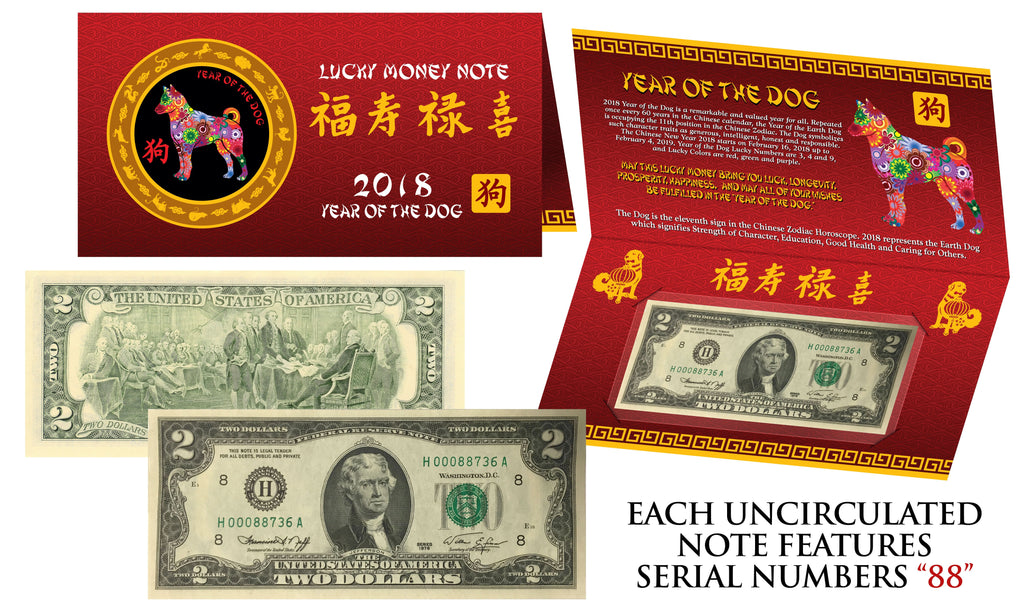 In celebration of the 2018 Year of the Dog Chinese Lunar New Year, we have announced the newest addition to its Lucky Money Collection…2018 Year of the Dog Lucky 8’s Serial Number Banknotes. The Year of the Dog 2018 product is designed with Decorative Chinese Symbolism and packaged in a Symbolic Red Folder adorned in Full-Color. Each folder contains an uncirculated Genuine Legal Tender United States Banknote.