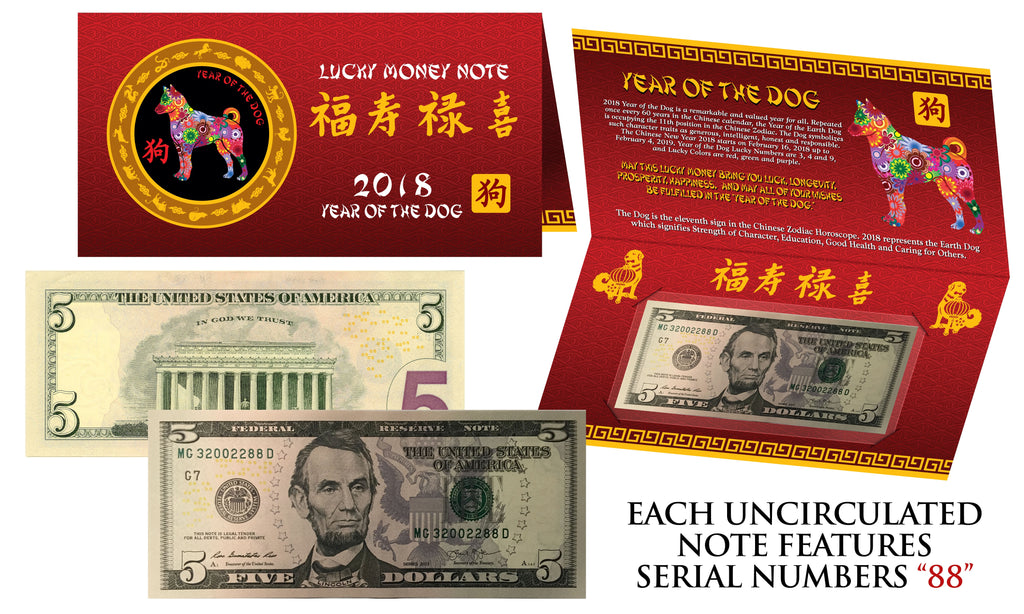 In celebration of the 2018 Year of the Dog Chinese Lunar New Year, we have announced the newest addition to its Lucky Money Collection…2018 Year of the Dog Lucky 8’s Serial Number Banknotes. The Year of the Dog 2018 product is designed with Decorative Chinese Symbolism and packaged in a Symbolic Red Folder adorned in Full-Color. Each folder contains an uncirculated Genuine Legal Tender United States Banknote.