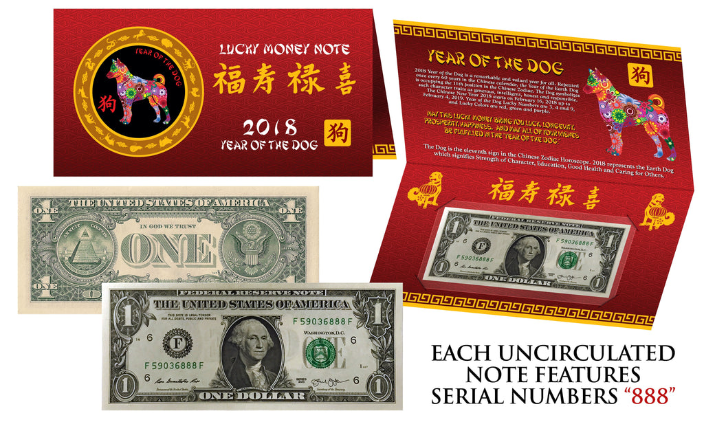 In celebration of the 2018 Year of the Dog Chinese Lunar New Year, we have announced the newest addition to its Lucky Money Collection…2018 Year of the Dog Lucky 8’s Serial Number Banknotes. The Year of the Dog 2018 product is designed with Decorative Chinese Symbolism and packaged in a Symbolic Red Folder adorned in Full-Color. Each folder contains an uncirculated Genuine Legal Tender United States Banknote.