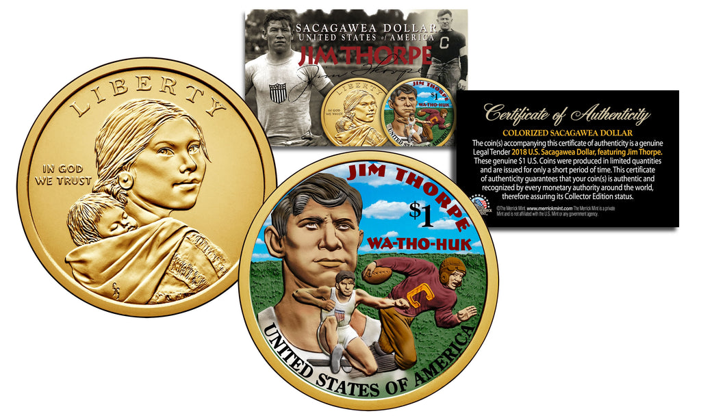 Since 2009, this $1 coin has displayed an annually-changing reverse design that recognizes the important contributions made by Indian tribes and individual Native Americans to the history and development of the United States. This year’s coin recognizes the accomplishments of Olympian and multi-talented athlete Jim Thorpe. The reverse design depicts Thorpe, with the foreground elements highlighting his football and Olympic achievements. Inscriptions are “JIM THORPE,” “WA-THO-HUK” (his native name), “UNITED STATES OF AMERICA,” and “$1.” The obverse (heads side) design retains the central figure “Sacagawea” carrying her infant son, Jean Baptiste. The inscriptions are “LIBERTY” and “IN GOD WE TRUST.” Keep your collection up to date with this Uncirculated Colorized coin – but remember, this design is only minted in 2018, and then never again! Full-Color EXCLUSIVE Certificate of Authenticity is Included with Each Coin.