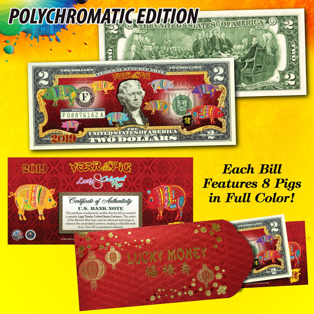 This bill is enhanced with 8 Pig's in FULL COLOR to represent the 2019 Chinese Year of the Pig. Number 8 has long been regarded as the luckiest number in Chinese culture, which is the reason 8 Polychromatic Color Pigs are used on the bill. The Number 8 represents prosperity, success, luck, good fortune, and wealth.