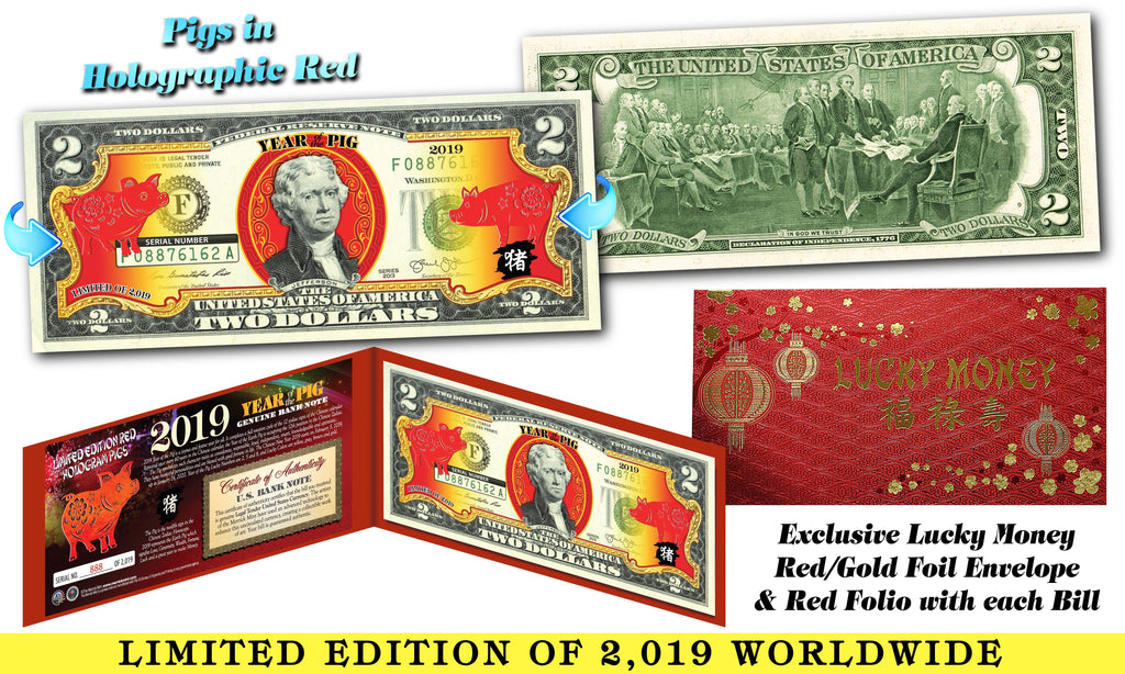 2019 Chinese New Year - YEAR OF THE PIG - Red Hologram Legal Tender U.S. $2 BILL - $2 Lucky Money with Red Envelope - LIMITED & NUMBERED of 2,019 Worldwide