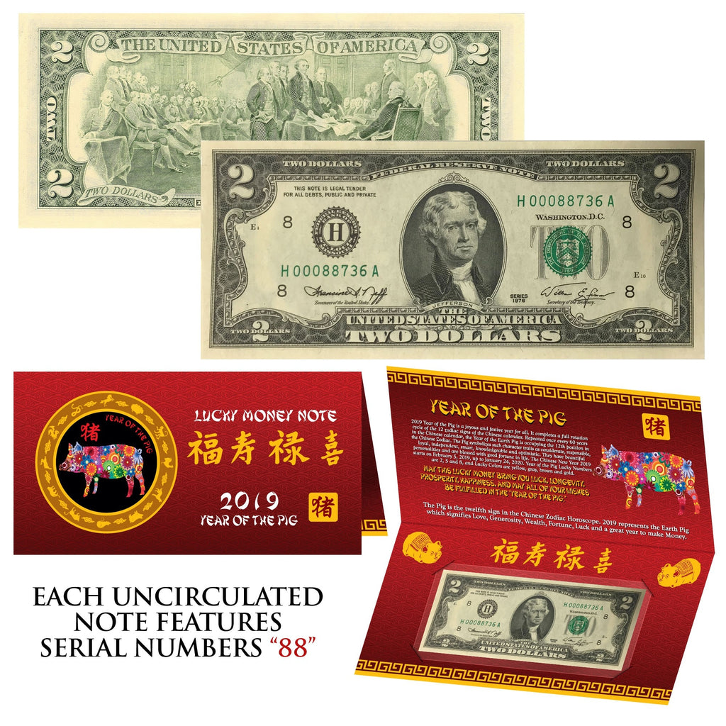 In celebration of the 2019 Year of the Pig Chinese Lunar New Year, we have announced the newest addition to its Lucky Money Collection…2019 Year of the Pig Lucky 8’s Serial Number Banknotes. The Year of the Pig 2019 product is designed with Decorative Chinese Symbolism and packaged in a Symbolic Red Folder adorned in Full-Color. Each folder contains an uncirculated Genuine Legal Tender United States Banknote.