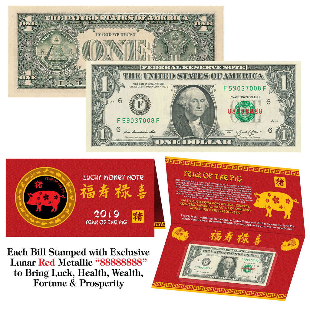 In celebration of the 2019 Year of the Pig Chinese Lunar New Year, we have announced the newest addition to its Lucky Money Collection…2019 Year of the Pig Lucky 8’s Banknotes. The Year of the Pig 2019 product is designed with Decorative Chinese Symbolism and packaged in a Symbolic Red Folder adorned in Full-Color. Each folder contains an uncirculated Genuine Legal Tender United States Banknote.