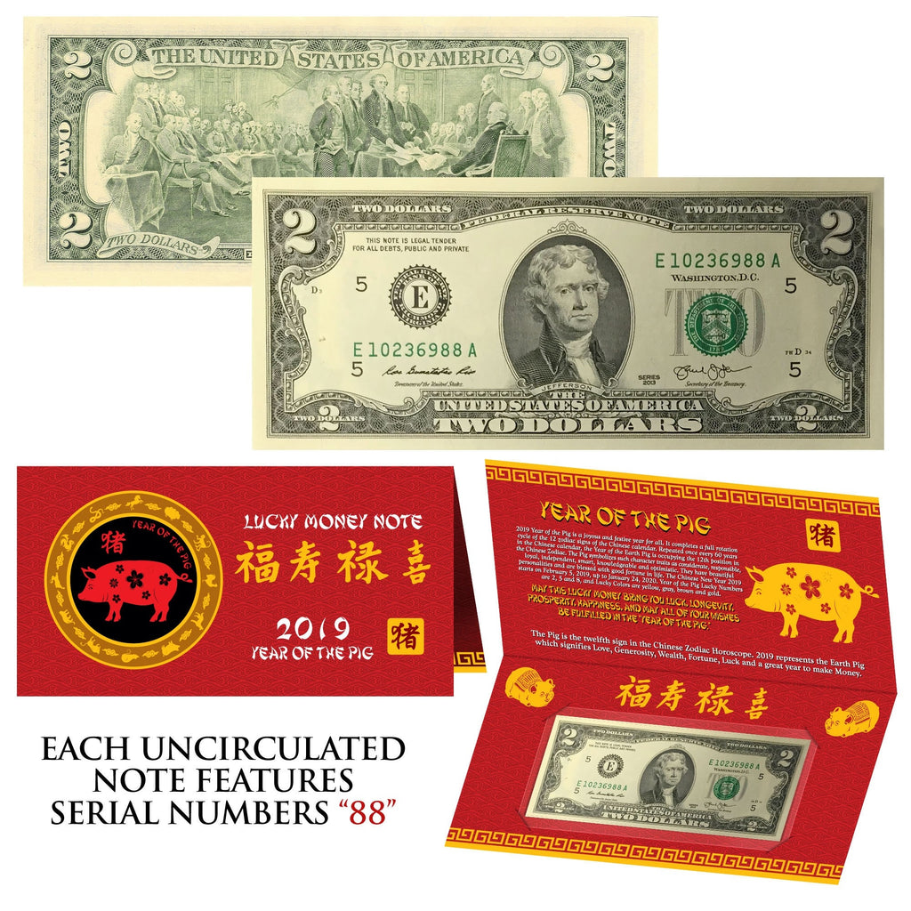 In celebration of the 2019 Year of the Pig Chinese Lunar New Year, we have announced the newest addition to its Lucky Money Collection…2019 Year of the Pig Lucky 8’s Serial Number Banknotes. The Year of the Pig 2019 product is designed with Decorative Chinese Symbolism and packaged in a Symbolic Red Folder adorned in Full-Color. Each folder contains an uncirculated Genuine Legal Tender United States Banknote.
