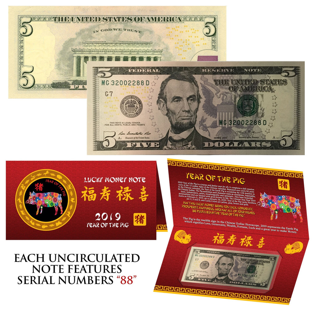 In celebration of the 2019 Year of the Pig Chinese Lunar New Year, we have announced the newest addition to its Lucky Money Collection…2019 Year of the Pig Lucky 8’s Serial Number Banknotes. The Year of the Pig 2019 product is designed with Decorative Chinese Symbolism and packaged in a Symbolic Red Folder adorned in Full-Color. Each folder contains an uncirculated Genuine Legal Tender United States Banknote.