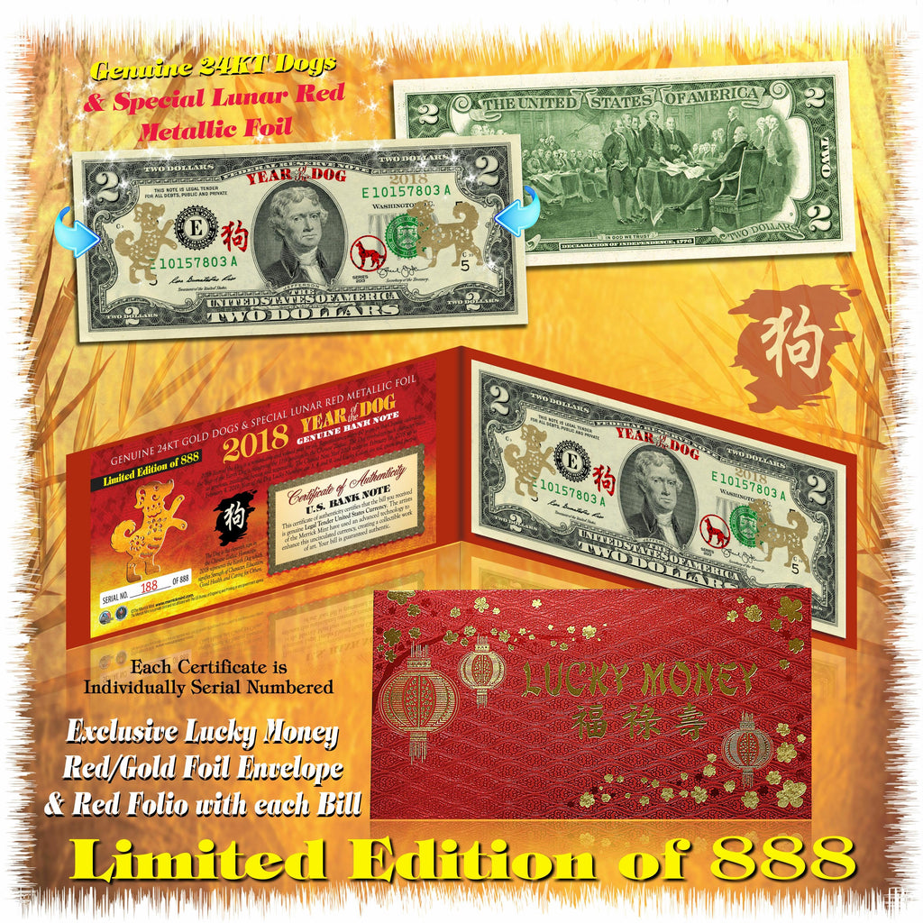 NEW FOR 2018 - Each Certificate is Individually Serial Numbered. LIMITED & NUMBERED TO ONLY 888 BILLS! This 2018 YEAR OF THE DOG uncirculated $2 Bill is Genuine Authentic Legal Tender of the United States, which has been enhanced with Genuine 24KT GOLD Dogs and Special exclusive LUNAR RED Metallic Foil Leaf images.