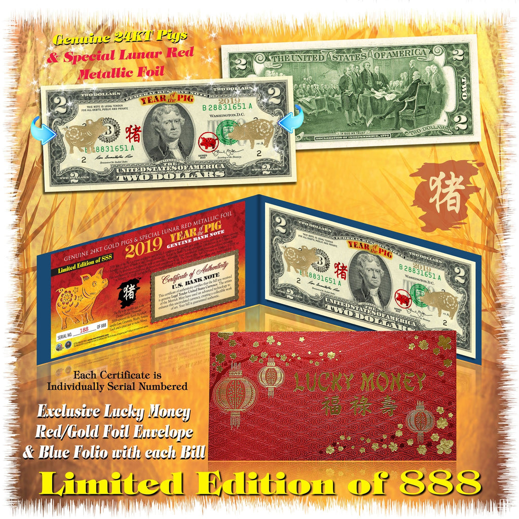 NEW FOR 2019 - Each Certificate is Individually Serial Numbered. LIMITED & NUMBERED TO ONLY 888 BILLS! This 2019 YEAR OF THE PIG uncirculated $2 Bill is Genuine Authentic Legal Tender of the United States, which has been enhanced with Genuine 24KT GOLD Pigs and Special exclusive LUNAR RED Metallic Foil Leaf images.