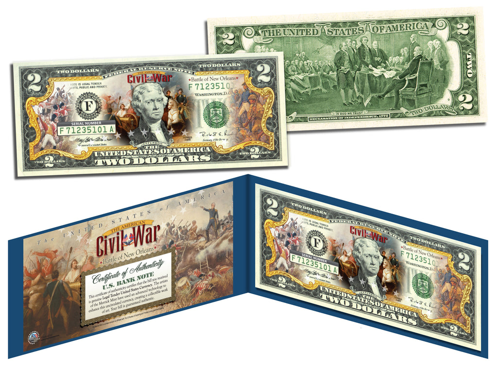 Battle of New Orleans (April 24–25, 1862) resulted in the Union capture of New Orleans which was a huge blow to the Confederacy. This AMERICAN CIVIL WAR – BATTLE OF NEW ORLEANS uncirculated $2 Bill is Genuine Authentic Legal Tender of the United States, which has been enhanced with colorized images of the Civil War battle. The colorized images are accomplished through a revolutionary new authentic & genuine colorization process pioneered by The Merrick Mint. Included is a blue display portfolio plus a Certificate of Authenticity to guaranty that your bills are authentic and recognized by every monetary authority around the world, and assuring its Collector Edition status. Only genuine Legal Tender $2 United States Bills are used for this unique colorization process. Each $2 Bill is in FRESH, CRISP, UNCIRCULATED condition, and was directly removed from untouched wrapped Federal Reserve sealed packs. Former U.S. President Thomas Jefferson is featured on the obverse of the note, along with the special colorization overlay. The Signing of the Declaration of Independence by John Trumbull is featured on the reverse. It is the only U.S. Currency note that features two Presidents, John Adams and Thomas Jefferson, and it is one of the most rarely seen BILLS in circulation and actual use.