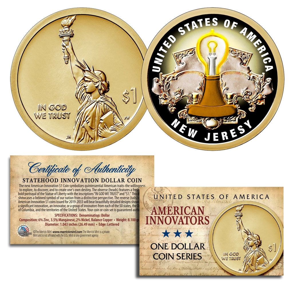 Here is your chance to own the American Innovation NEW JERSEY 2019 Statehood $1 Dollar Colorized Coin. The American Innovation $1 Coin symbolizes quintessential American traits—the willingness to explore, to discover, and to create one’s own destiny. The coins showcase an innovation, innovator or group of innovators from each State or Territory. The program is a multi-year initiative to honor innovators and innovations from each state, the District of Columbia, and five U.S. territories. The obverse (heads) features a fresh and bold portrayal of the Statue of Liberty with the inscriptions “IN GOD WE TRUST” and “$1.” This design showcases a beloved symbol of our nation from a distinctive perspective. The Colorized reverse (tails) design features an Edison bulb against an ornate background.