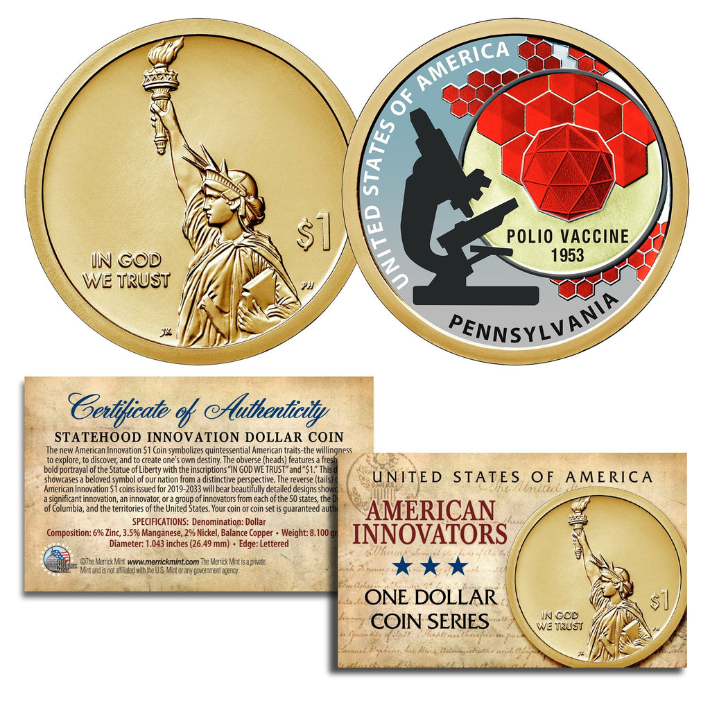 Here is your chance to own the American Innovation PENNSYLVANIA 2019 Statehood $1 Dollar Colorized Coin. The American Innovation $1 Coin symbolizes quintessential American traits—the willingness to explore, to discover, and to create one’s own destiny. The coins showcase an innovation, innovator or group of innovators from each State or Territory. The program is a multi-year initiative to honor innovators and innovations from each state, the District of Columbia, and five U.S. territories. The obverse (heads) features a fresh and bold portrayal of the Statue of Liberty with the inscriptions “IN GOD WE TRUST” and “$1.” This design showcases a beloved symbol of our nation from a distinctive perspective. The Colorized reverse (tails) design depicts an artist’s conception of the polio virus at three different levels of magnification along with the silhouette of a period microscope, representing the extensive research that was conducted to develop a cure for polio.