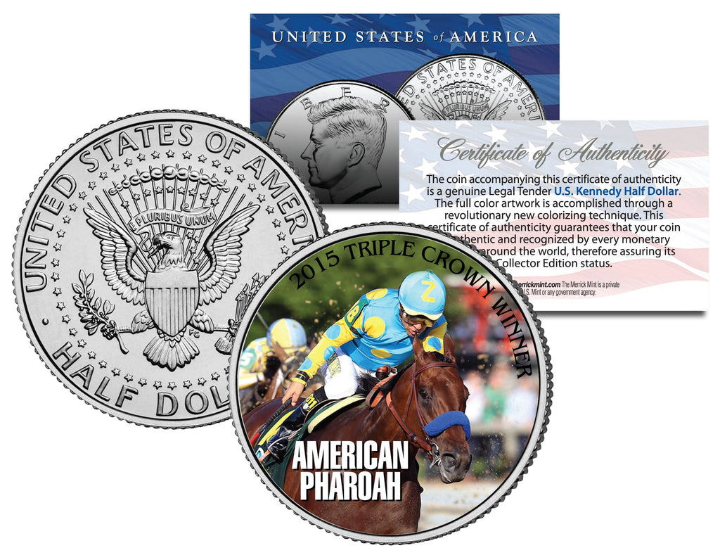 Here is your opportunity to own or gift the AMERICAN PHAROAH 2015 Triple Crown Winner colorized JFK Kennedy Half Dollar U.S. Coin, which has been enhanced with a beautifully colorized image by the Merrick Mint. Each coin comes in a premium coin capsule with a full color Certificate of Authenticity to guarantee that your coin is authentic and recognized by every monetary authority around the world, assuring its Collector Edition status. This Legal Tender United States coin has been colorized with an application of special inks directly to the surface of the coin, using a unique and painstakingly multicolor coin process, which achieves a level of detail, color saturation, and durability that is #1 in the coin industry. The result is an everlasting colorized coin collectible of ultra-high quality. The Kennedy half dollar is a U.S. fifty cent coin with coin year and mint marks chosen at random.