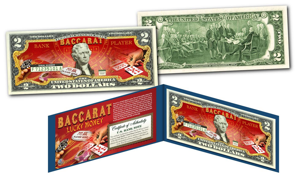 This BACCARAT Casino Game $2 Bill is enclosed in an attractive blue folio and is adorned with Chinese symbolism. Baccarat is not just for James Bond anymore. It is the game of choice for Chinese gamblers from mainland China and Hong Kong. Both groups make up the majority of gamblers in Macau. And the game brings some unique, superstitious rituals that makes even more exciting. This Lucky Baccarat $2 Bill is a sure collector's item and Luky item choice for Baccarat players around the world. They are In-Stock and Shipping immediately. We also ship internationally.