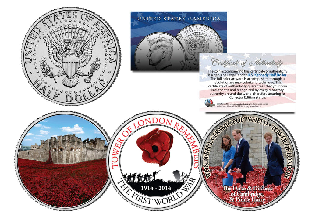The Blood-Swept Lands and Seas of Red installation at the Tower of London was made with 888,246 hand-made ceramic poppies with each representing the death of a British and Commonwealth soldier during World War One. Here is your chance to own the TOWER OF LONDON REMEMBERS THE FIRST WORLD WAR complete set of three (3) colorized JFK Kennedy Half Dollar U.S. Coins. These high-quality, genuine Legal Tender United States coins have been colorized using a unique painstaking multicolor authentic process by the Merrick Mint. Colorizing coins involves the unique application of special inks directly to the surface of a coin that achieves a level of detail, color saturation, and durability that is #1 in the coin industry. The result is an everlasting colorized coin collectible of ultra-high quality. Each coin comes in a premium coin capsule. The 3-coin set comes with a Certificate of Authenticity to guarantee that your coins are authentic and recognized by every monetary authority around the world, assuring its Collector Edition status. The Kennedy half dollar is a U.S. fifty cent coin with coin year and mint marks chosen at random.