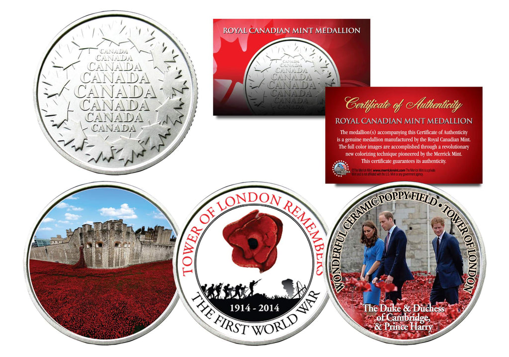 The Blood-Swept Lands and Seas of Red installation at the Tower of London was made with 888,246 hand-made ceramic poppies with each representing the death of a British and Commonwealth soldier during World War One. Here is your chance to own the TOWER OF LONDON REMEMBERS THE FIRST WORLD WAR complete set of three (3) colorized Royal Canadian Mint Medallions. The 3-medallion set has been beautifully enhanced with colorized images by the Merrick Mint. The 3-medallion set comes with a full color Certificate of Authenticity with each medallion coming in a premium coin capsule. These medallions have been colorized with an application of special inks directly to the surface, using a unique and painstakingly multicolor process, which achieves a level of detail, color saturation, and durability that is #1 in the industry. Each medallion is about the same size as a U.S. Half Dollar coin and features a Canada Maple Leafs design on the reverse and a colorized image on the obverse.