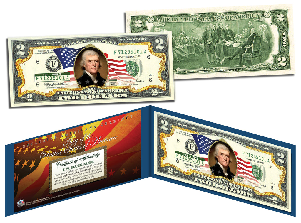 This uncirculated $2 Bill is Genuine Authentic Legal Tender Currency of the United States, which has been colorized enhanced with an exclusive Americana design by the Merrick Mint, using an advanced technology to create a collectible work of art. Included is a blue display portfolio plus a Certificate of Authenticity to guaranty that your bill is authentic and recognized by every monetary authority around the world, assuring its Collector Edition status. Each $2 Bill is in FRESH, CRISP, UNCIRCULATED condition, and was directly removed from untouched wrapped Federal Reserve sealed packs. Former U.S. President Thomas Jefferson is featured on the obverse of the note, along with the special colorization overlay. The Signing of the Declaration of Independence by John Trumbull is featured on the reverse. It is the only U.S. Currency note that features two Presidents, John Adams and Thomas Jefferson, and it is one of the most rarely seen BILLS in circulation and actual use.