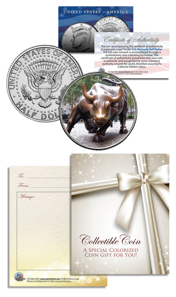 This WALL STREET BULL coin is a treasured collectible. Here is your chance to own or gift a beautifully colorized JFK Kennedy Half Dollar U.S. Coin. This high-quality genuine Legal Tender U.S. coin has been colorized using a unique painstaking multicolor authentic process. Colorizing coins involves the unique application of special inks directly to the surface of a coin that achieves a level of detail, color saturation, and durability that is #1 in the coin industry. The result is an everlasting colorized coin collectible of ultra-high quality. Each coin comes in a premium coin capsule with a Certificate of Authenticity to guaranty that your coin is authentic and recognized by every monetary authority around the world, assuring its Collector Edition status. As a bonus, you will also receive an attractive, handy Gift Message Card for you to personalize when giving the coin as a gift.